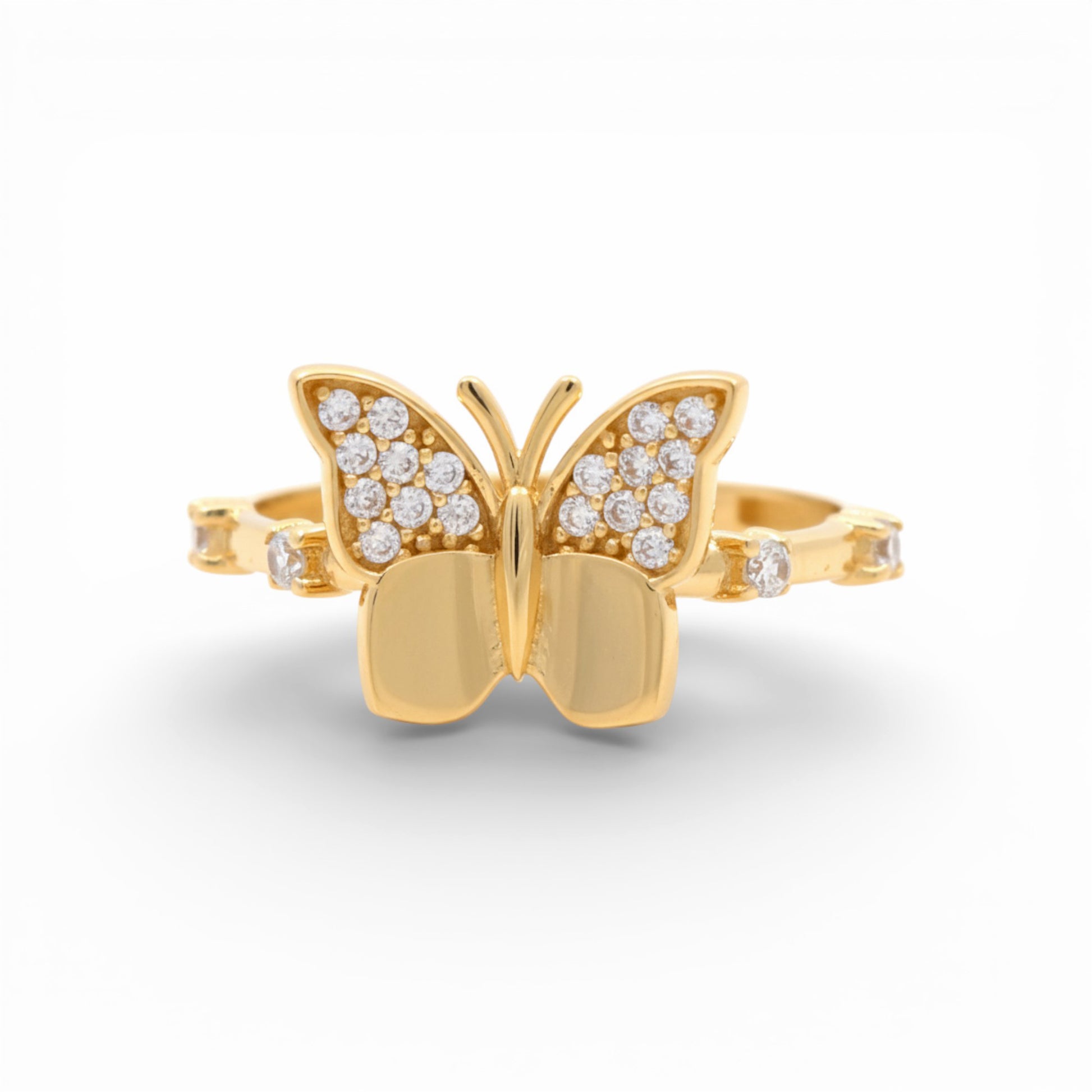Let your style take flight with this enchanting 14K Yellow Gold Butterfly ring. A symbol of transformation and new beginnings, the butterfly centerpiece is delicately sculpted and accented with sparkling Cubic Zirconia stones on the wings for a touch of whimsy and elegance. Weighing 1.7 grams, this is a dainty and lightweight ring, designed to sit comfortably on the finger without feeling bulky. The Size 7.5 fit offers a little extra room, making it perfect for daily wear or as a sweet addition to a ring stack.
