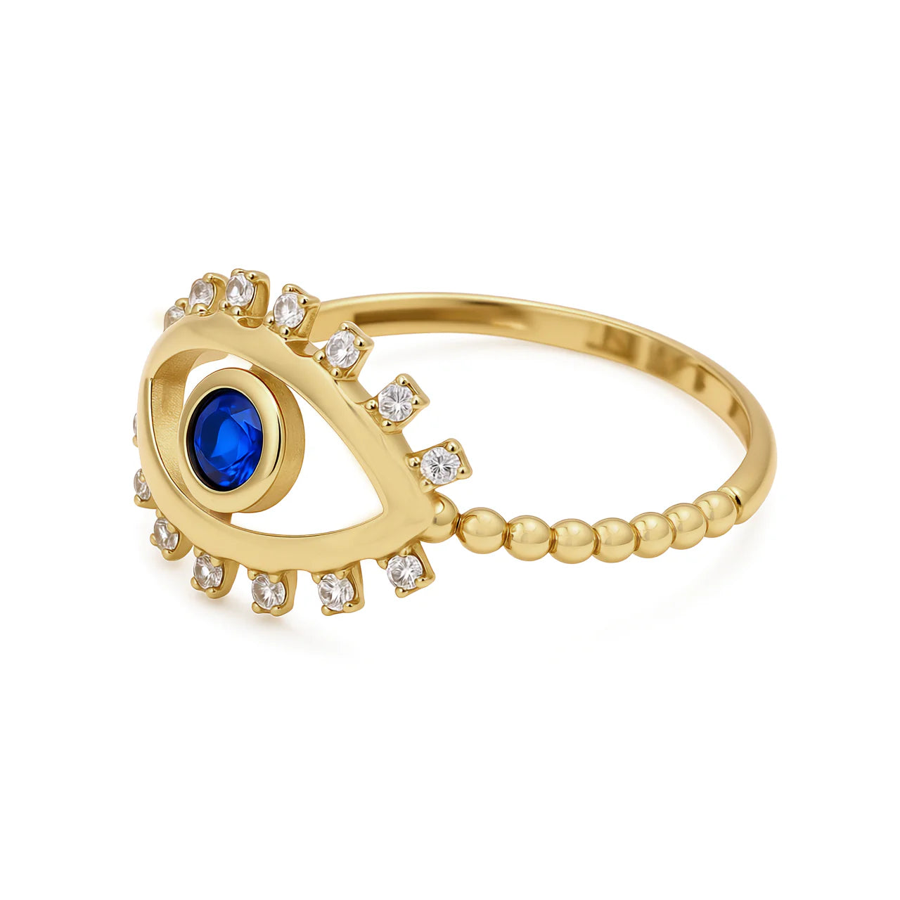This 14K yellow gold women’s eye ring features a captivating blue cubic zirconia center, symbolizing protection, intuition, and clarity. Its delicate design makes it perfect for everyday wear while adding a meaningful pop of color to your look.