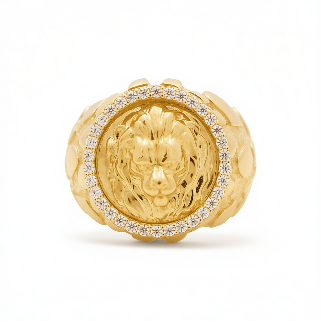 This 14K yellow gold men’s lion ring features a commanding round lion head design set against a textured nugget-style background, creating a rugged yet luxurious look. Sparkling cubic zirconia accents add brilliant contrast, enhancing the ring’s bold character and giving it an unmistakable presence.
