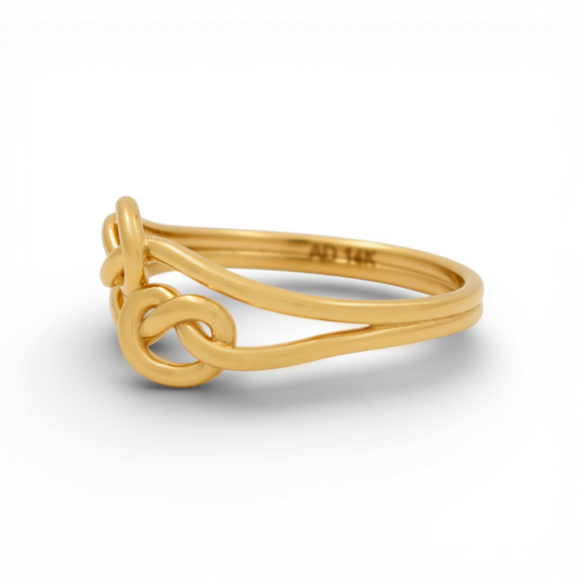 Symbolize your everlasting bond with this delicate 14K Yellow Gold "Double Knot" ring. Featuring the classic love knot design, this piece represents a connection that cannot be untied. Weighing 2.3 grams, this version is slightly lighter and more dainty than our heavier knot rings, making it an exceptional choice for those who prefer jewelry with a subtle, feminine touch. The high-polish yellow gold catches the light beautifully, while the Size 7.5 fit ensures comfortable, all-day wear. It looks stunning worn alone or stacked with other thin bands.