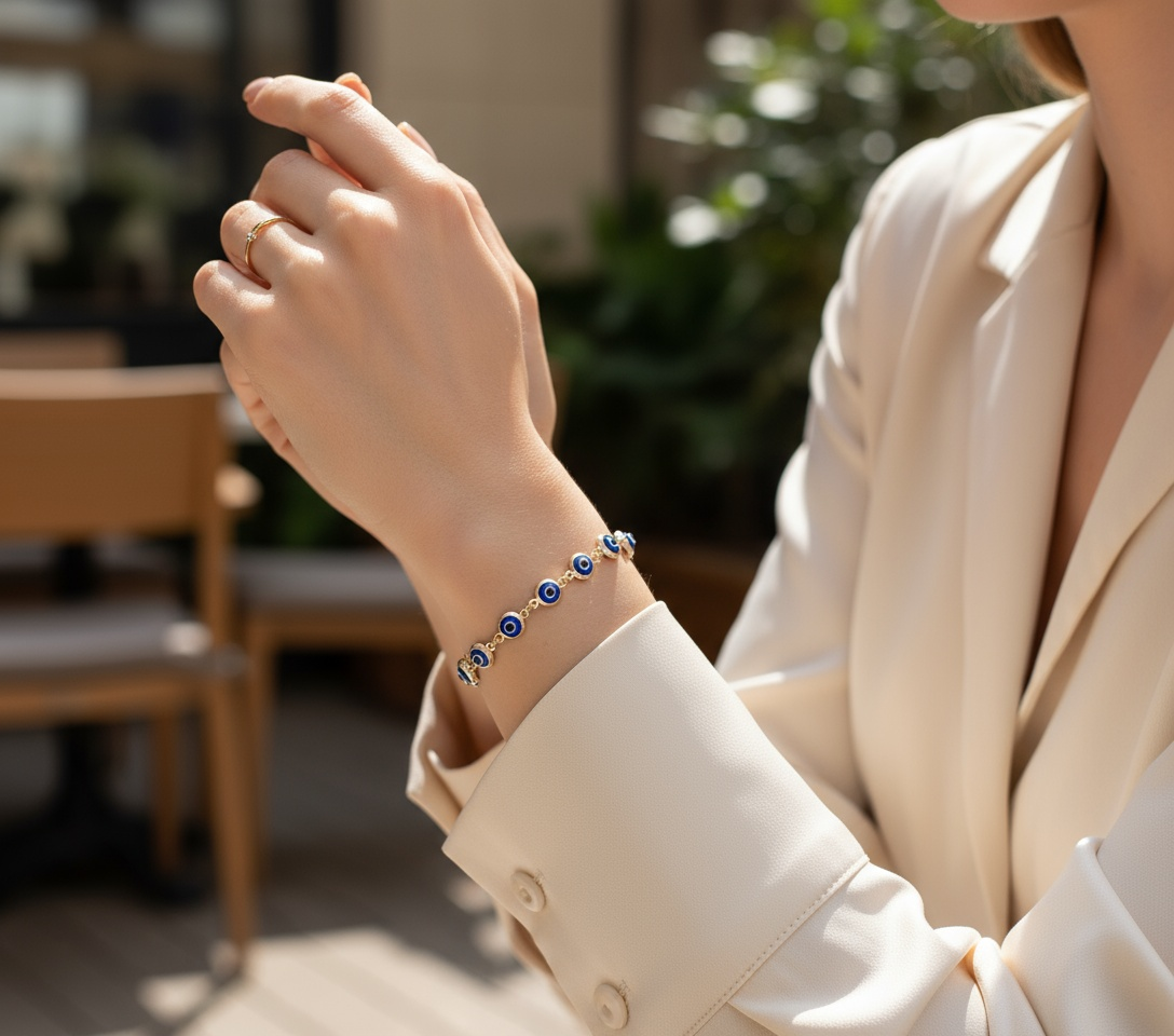 This 14K yellow gold women’s bracelet features delicate blue evil eye charms, known for bringing good luck and guarding against negative energy. Each charm shimmers beautifully against the warm glow of gold, creating a perfect blend of meaning and elegance.